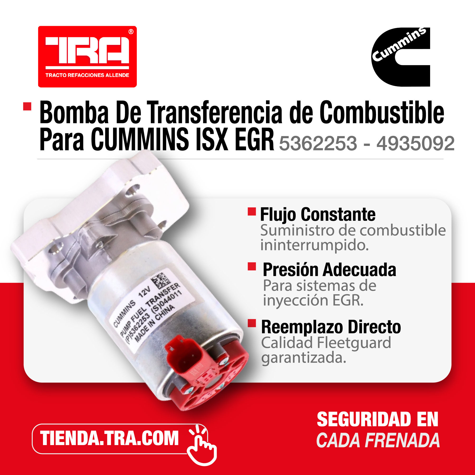 Bomba de transferencia de combustible de 12V para motores Cummins ISX, QSX y X15 con sistema de inyección de alta presión (HPI). Asegura el flujo constante de diésel desde el tanque hacia el sistema de inyección con la presión adecuada, garantizando arranques confiables y rendimiento óptimo en operaciones de larga distancia.
