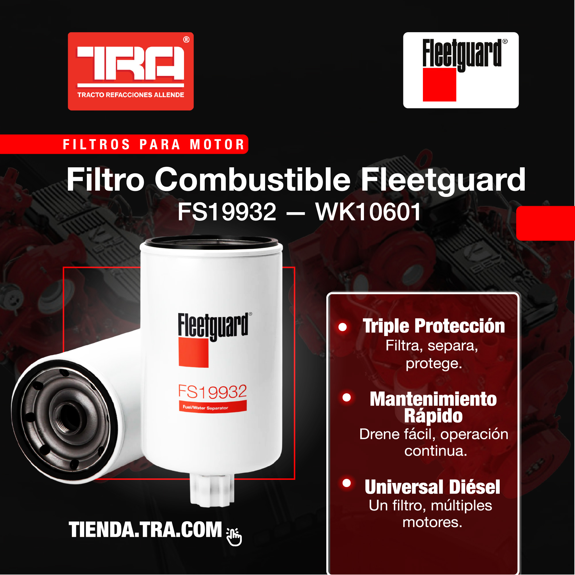 Filtro de combustible Fleetguard de alto desempeño que mejora la calidad del diesel y alarga la vida del motor.