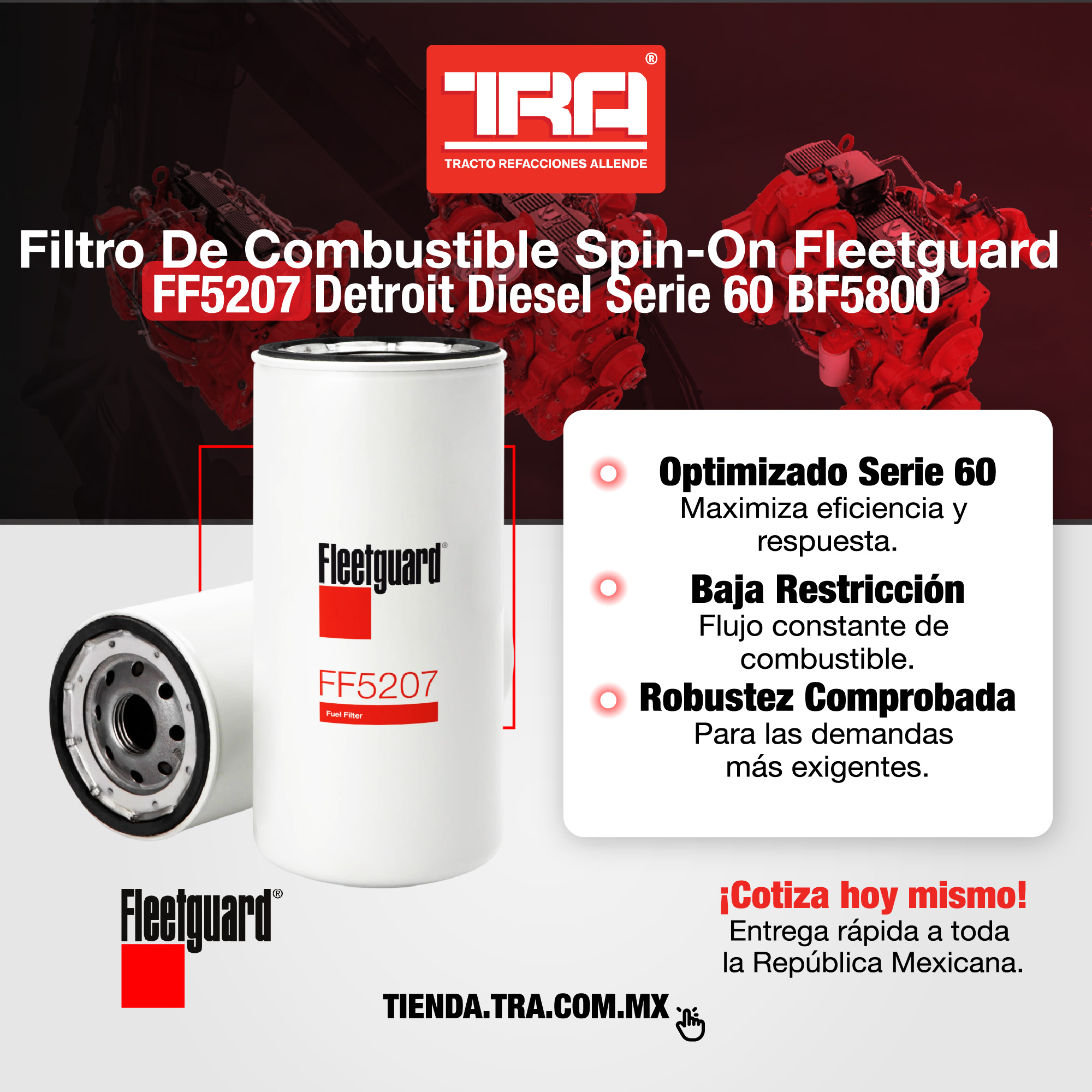 El FF5207 Fleetguard protege sistemas de combustible en motores Detroit Diesel Serie 60, compatible con BF5800.