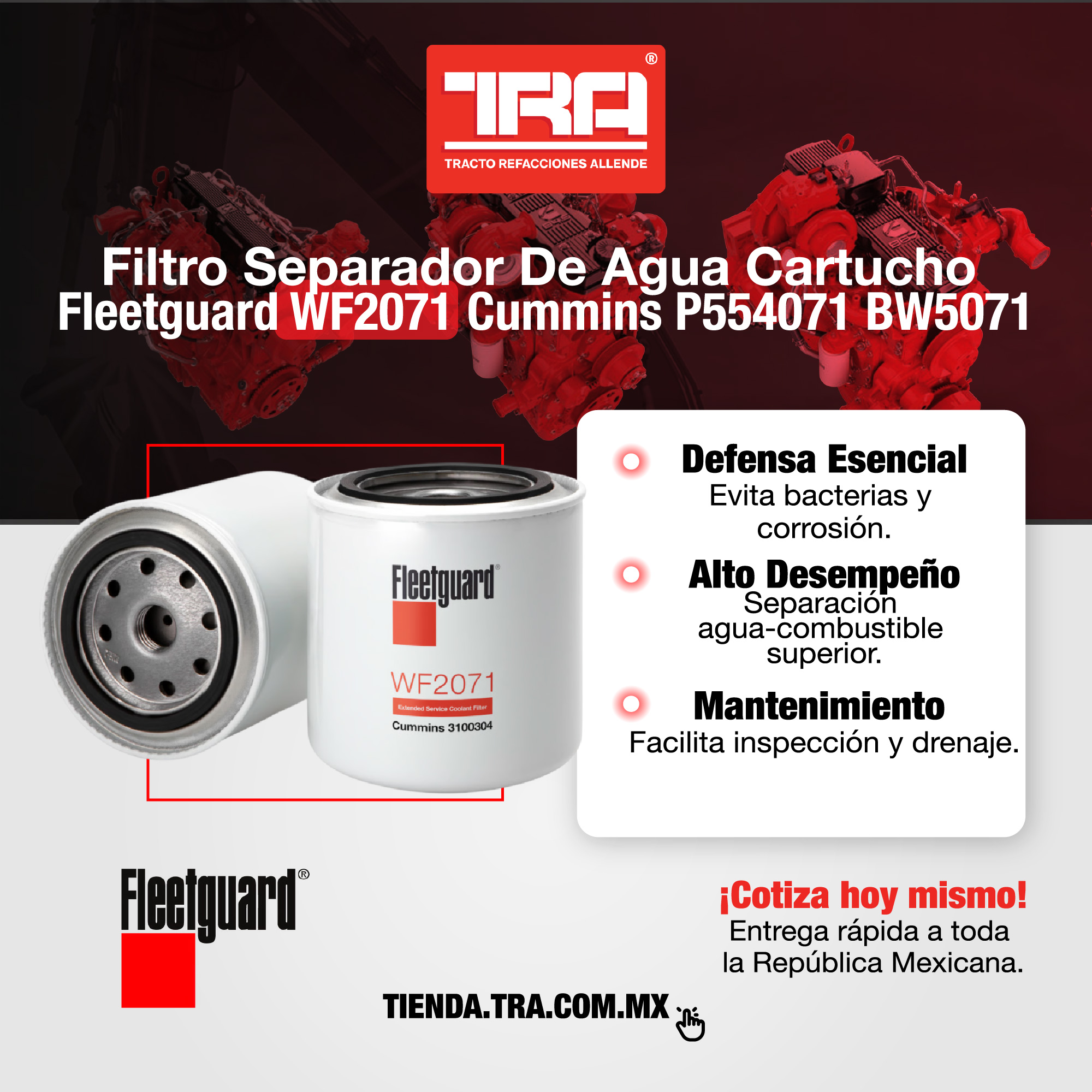 El WF2071 Fleetguard protege motores Cummins, compatible con P554071 y BW5071, eliminando agua del combustible.