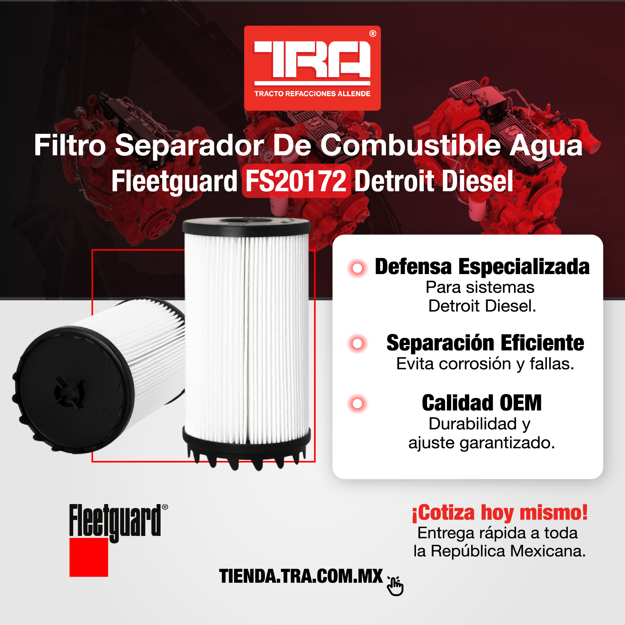El FS20172 Fleetguard protege motores Detroit Diesel eliminando agua y contaminantes del combustible.