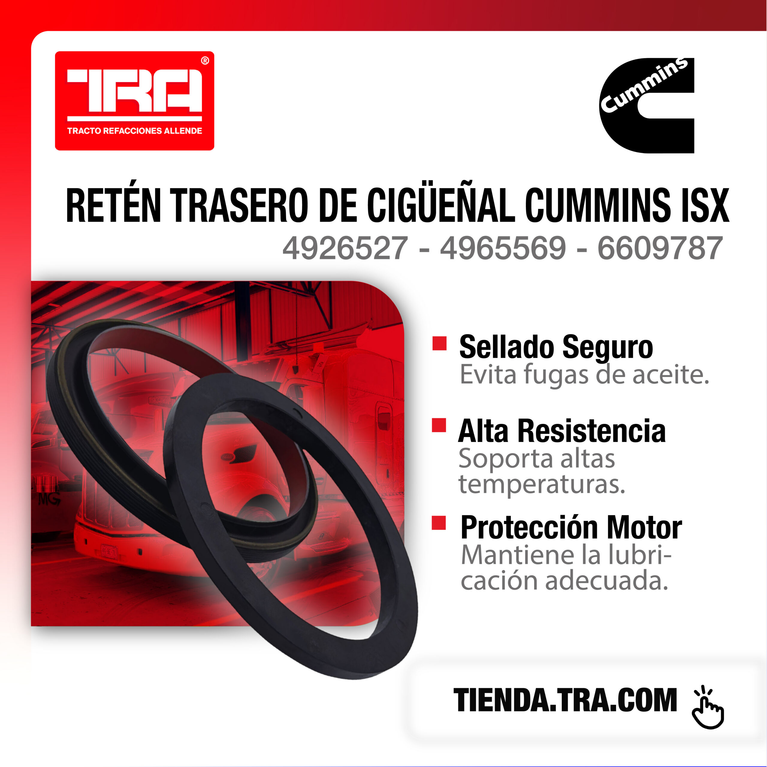 Retén trasero de cigüeñal para motor Cummins ISX, referencias 4926527, 4965569 y 6609787. Sello de alta precisión que evita fugas de aceite en la parte trasera del cigüeñal, manteniendo la integridad del sistema de lubricación. Fabricado con elastómeros resistentes a altas temperaturas. Pieza esencial en el mantenimiento preventivo del motor Cummins ISX para garantizar su larga vida útil.