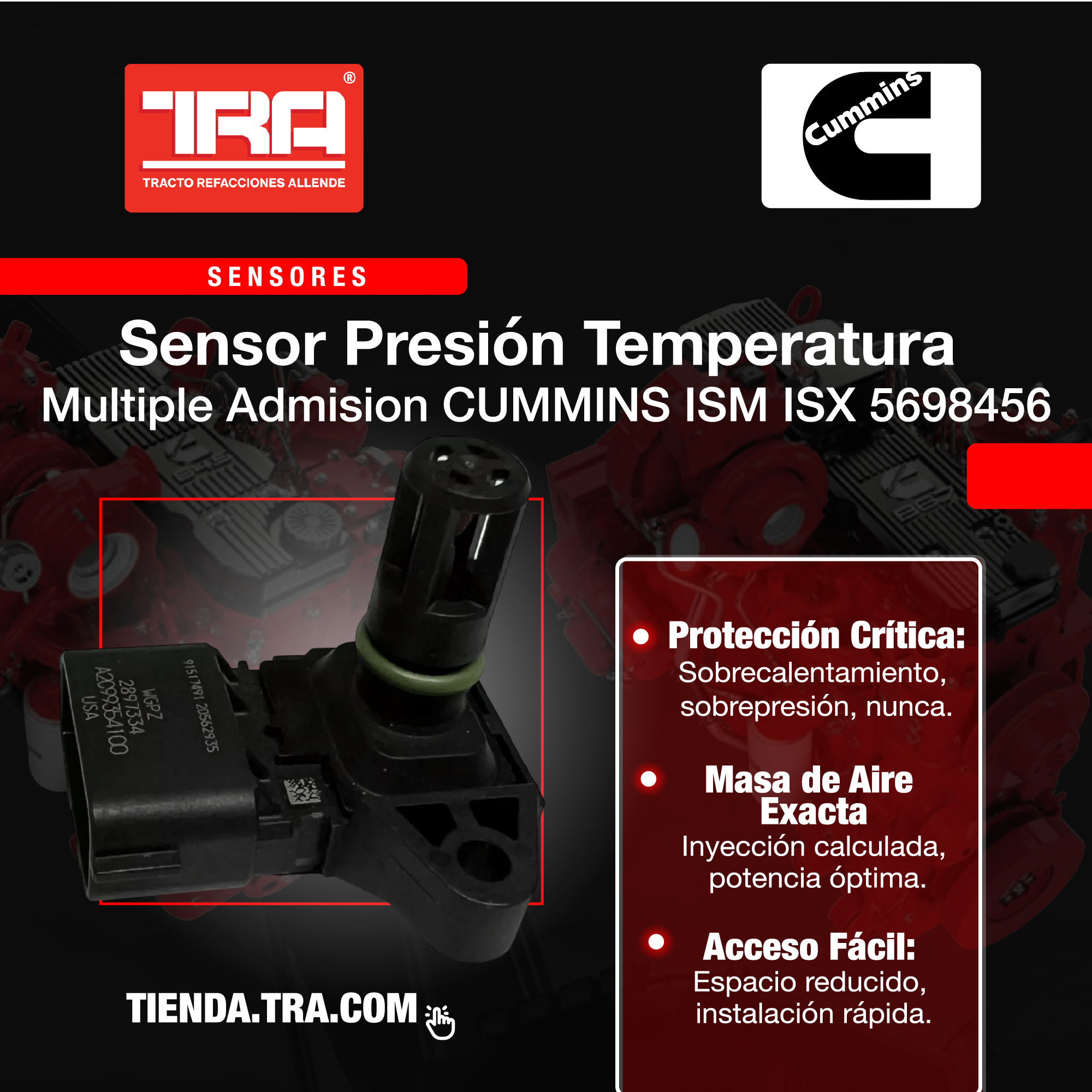 Sensor MAP Cummins que mide presión y temperatura en la admisión para optimizar consumo y potencia. Compatible con ISM e ISX.